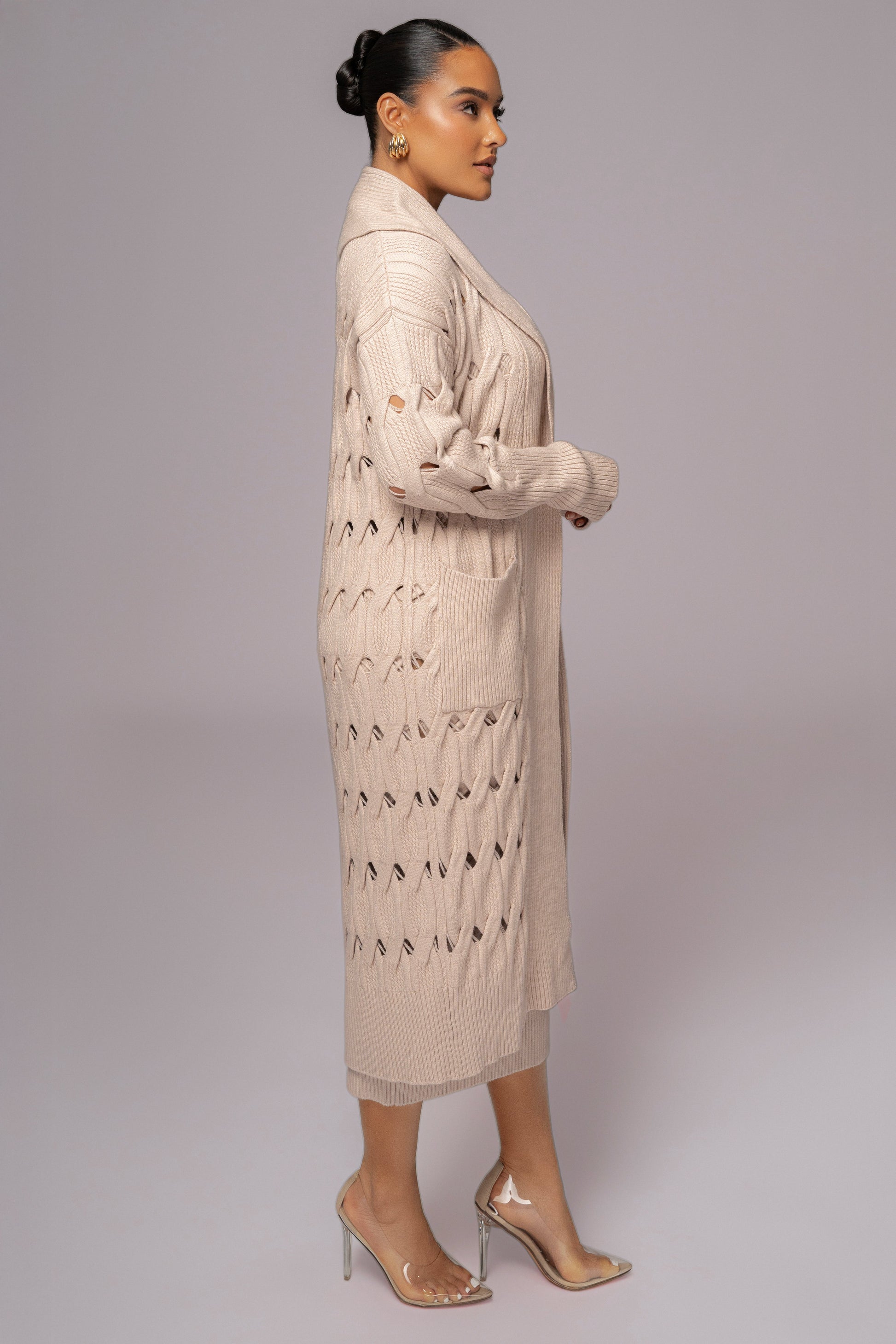 Take your layering style to new heights with the Beige Brixton Knit Cardigan, a perfect blend of comfort and sophistication. Featuring a timeless shawl collar, long sleeves, and functional side pockets, this cardigan effortlessly combines style and practicality. Constructed from luxurious thick knit material, it delivers plush comfort, while the intricate cutout pattern adds a chic, modern texture. Whether you're lounging or layering for a night out, this cardigan’s relaxed silhouette and refined details make it a versatile wardrobe essential. Pair with our Darlah Knit Crop Top and Morgan Knit Maxi Skirt for the full look. Stretchy.